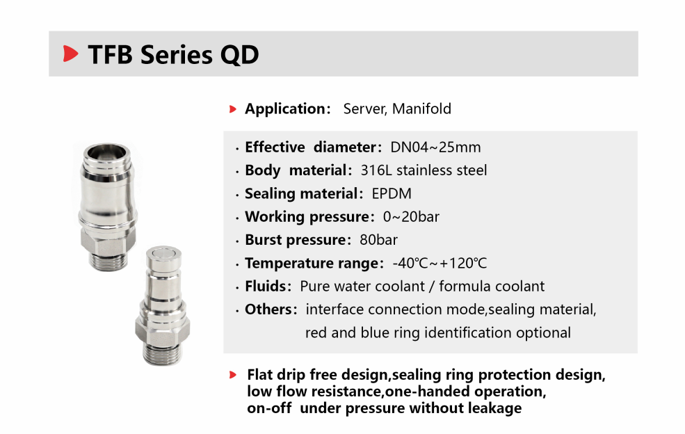ACT designs and manufactures every quick disconnect couplings (QDs) to specifically meet the demands for high performance in liquid cooling for sensitive and critical environments, including the product series including UQD/ UQDB(blind)/TBV(ball valve)/TFA/ TFB/ TFC/ TFD。The quick release couplings from ACT offers strength and durability, ease of use, and reliability.