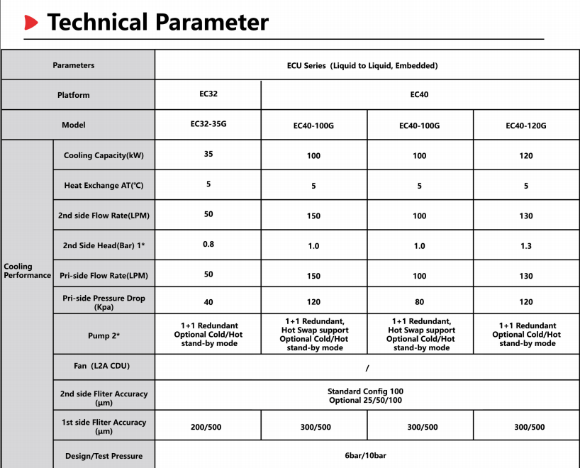 The ECU / AECU / RCU / ARCU(AALC) cooling distribution unit is a device mainly usedto achieve physical isolation and heat exchange of primary and secondary coolingmedia. lt integrates secondary side drive modules, stabilizing and replenishing liquidmodules, degassing modules, filtering modules, and real-time monitoring functionsfor temperature, flow, and pressure. lt has the features of high redundancy and reliabil-ity of key components, fast installation of interface support, and real-time intelligentcontrol of key parameters, and is suitable for application scenarios in multi cabinetcomputer rooms.